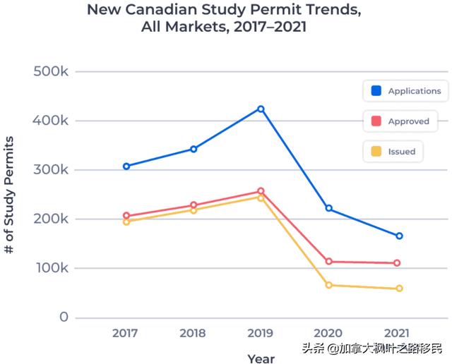 从2019年到2020年,加拿大学签整体申请(Application)率下降了48.3%,而获批(Approved)的学签数量下降了55.9%。学签的签发(Issued)的数量整体下降了73.5%。随着疫情的情况有所好转以及全球疫苗接种率的提高,留学生们也在恢复他们的出国留学计划。