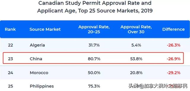 再来看看中国留学生的加拿大学签获批率。20岁以下的学签获批率在90%以上。主要看20岁-25岁之间的学签获批率在80.7%;而超过30岁的学签获批率仅为53.8%。