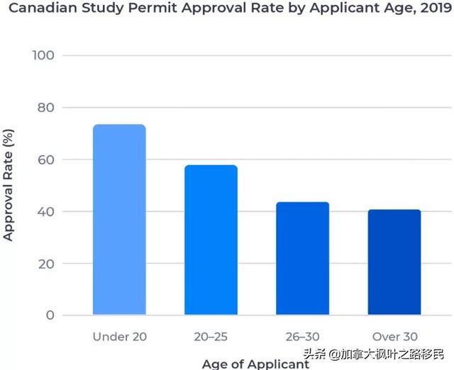 由于2020年受疫情影响,我们参考2019年的整体数据。2019年加拿大学签获批率,20岁以下的最高,获批率在75%左右;20-25岁的学签获批率不到60%;26-30岁的学签获批率略超40%;而超过30岁的学签获批率仅有40%。