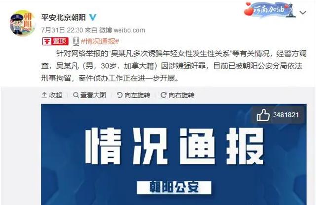 一开始网友们纷纷抱着吃瓜的心态去看待这件事情,想着这件事件闹个几天就会过去,但是自从北京朝阳警方在社交平台上对这件事情的主人公吴亦凡进行了一个通告,整件事情彻底闹开来。