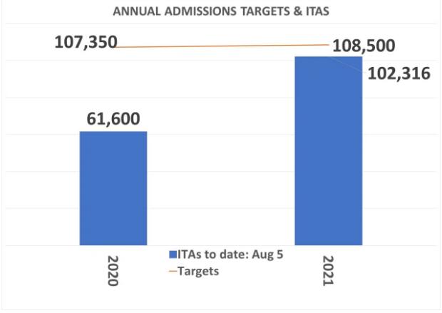 与去年同期相比,申请邀请(ITAs)的数量几乎翻了一番。这表明,IRCC正在加倍努力,在2021年通过EE快速通道入境系统接纳10.85万名新移民。由于仅例行CEC和PNP的抽分邀请,最低分数要求一直在上下波动。CEC抽取通常有较低的临界值,因为抽取集中在一类申请者的分数段中。例如,在联邦技术工人计划中,他们没有与其他项目竞争。因为更多的CEC候选人从顶部被选中,所以最低分数线下降。通过省级提名的推荐候选人会自动获得600分。