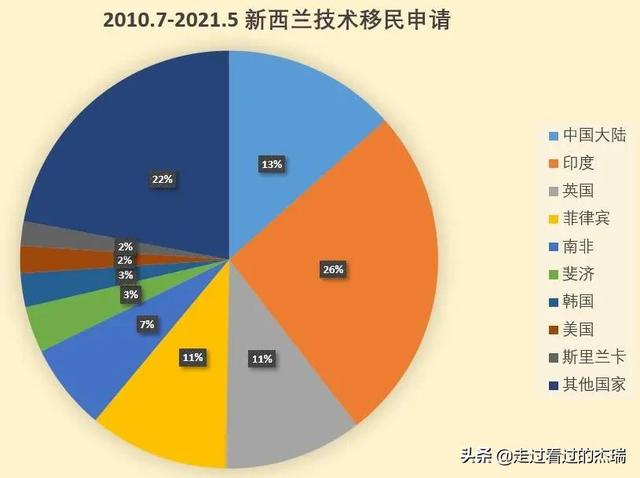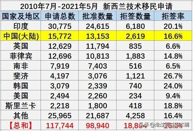 在2010年7月1日至2021年5月31日间,来自中国大陆地区的技术移民申请总数为15,772份。其中,新西兰移民局批准了13,153份申请,拒签率为16.6%。