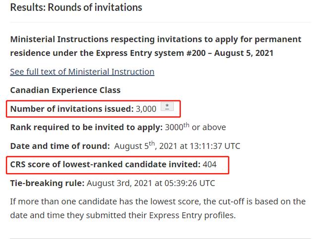 加拿大时间8月5日,EE再一次进行了加拿大经验类(Canadian Experience Class)筛选。本次筛选获邀最低分为404分,获邀人数3000人 。其中获邀最低分为404分的申请人,需要在2021年8月3日前入池EE,即在8月3日后入池的申请人此次不会被获邀。
