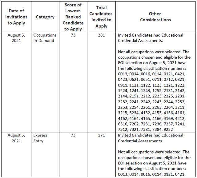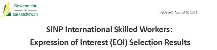 萨省技术移民无雇主类别于加拿大时间2021年8月5日进行了最新一轮的EOI筛选。此轮筛选邀请了EE及非EE类别的申请人,最低邀请分数为均为73分,邀请人数分别为171和281人。