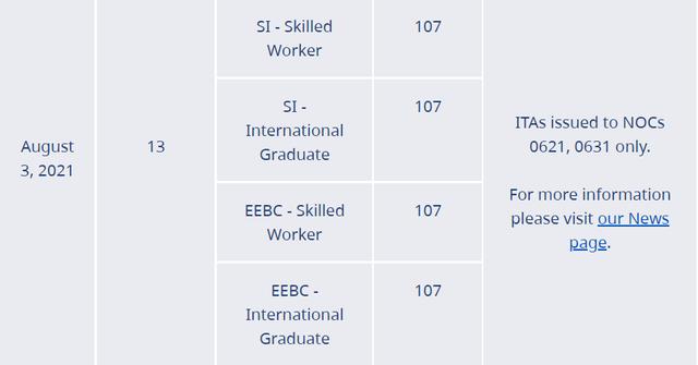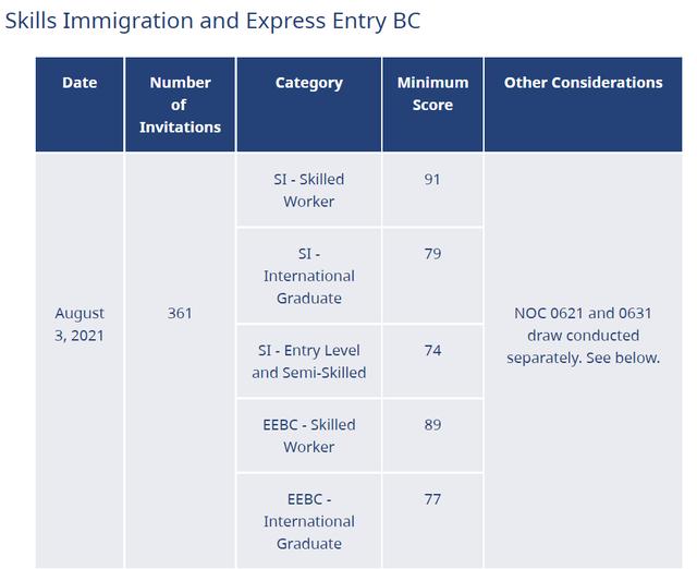 加拿大时间2021年8月3日,BCPNP官网公布新一轮技术移民抽选情况。