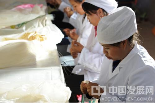 (图为移民在厂房扎小把粉丝)