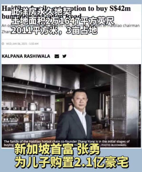 不得不说,海底捞挺赚钱的,2019年净利润达到23.45亿元,2020年,张勇团队套现了15.6亿港元。赚了钱,自然是要花的,早在2017年,张勇便以个人名义在新加坡格格路,花费1700万新加坡元,购入一座顶级豪宅。