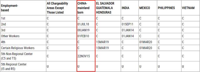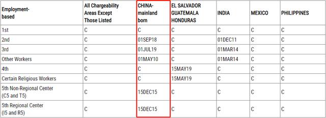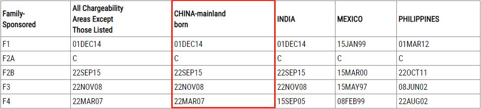 EB-2前进幅度也比较大,表A前进了3个月,表B前进了2个月。EB-3表A和表B都没有变化,处于原地踏步状态,上个月EB-3表A尚且前进了1个礼拜,这次却直接不动了,难免让人失望。让人稍感欣慰的是,EB-3非技术移民(Other Workers,即EW-3)的表A有变化,和8月份排期一样,前进了1个月(表B无变化)。EB-4有名额,无排期。EB-5投资移民非区域中心类别(也叫直接投资)表A排期前进了1周,区域中心类别受重新授权法案到期的影响则显示“U”,暂无签证配额可用,表B中两种类别的投资移民排期都处于原地踏步状态,前景不明。表A: