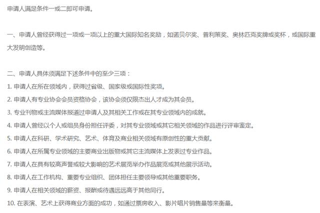二、美国EB-1A杰出人才移民EB-1A是专为杰出人才移民设置的绿卡类别,是绿卡申请中的第一优先类别,无需排期,要求申请人在科学、艺术、商业、教育或体育等领域,拥有高超的专业技能,并在其所属领域里属于占少数顶尖人才,且其才能和成就在其专业领域里获得国际国内的公认和推崇,这一类别不需要雇主担保就可申请移民。申请要求: