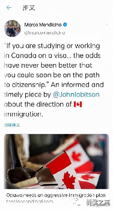 2021年2月19日,Marco Mendicino发推文:持签证并且正在加拿大工作或留学的朋友们,将会有前所未见的拿永居的利好政策。