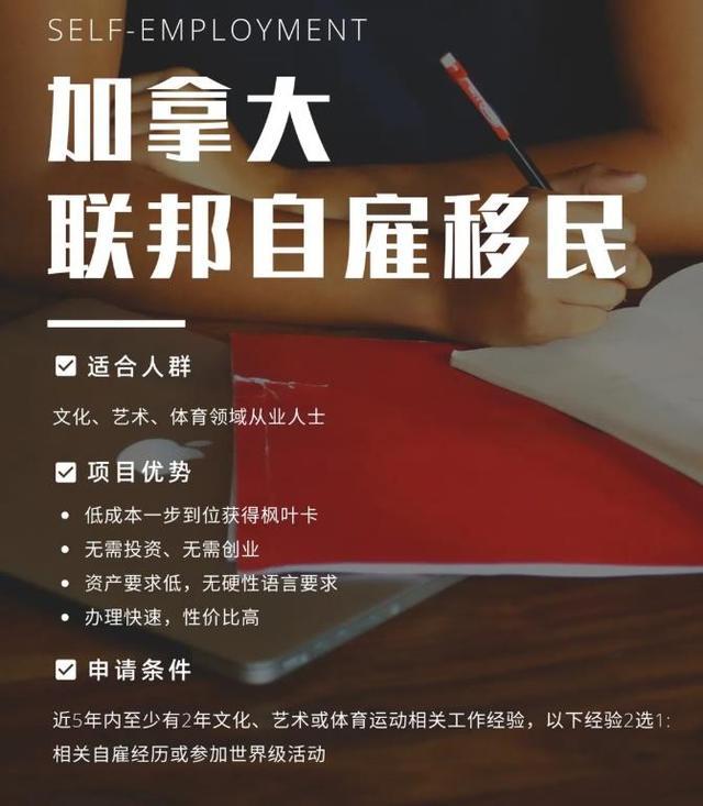 加拿大联邦自雇移民是文化体育艺术工作者通往加拿大的捷径, 主要适用于在文化、艺术、体育等领域内有至少两年自雇经验,自身有一定专长,有意愿和能力在加拿大继续从事相关领域工作,并做出一定贡献的人,比如画家、作家、演员、运动员等。表面上看该项目针对的申请群体比较狭隘,实际上有许多职业都能够符合要求,因此自雇移民在申请有着很大的灵活性和发挥空间,具体可以咨询专业的移民顾问,深挖个人履历以达到申请要求。