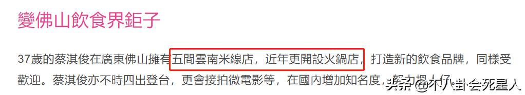 37岁的前TVB配角蔡淇俊算是TVB剧的熟脸配角了,曾经出演过《同事三分亲》,但一直星途平平。14年的时候,蔡淇俊决定放弃在香港的演艺事业,来内地做生意,现在他已经成功在佛山开了5间饮食店了。