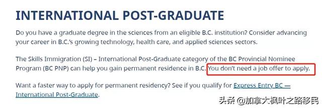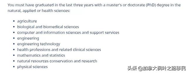 不用offer,无须工作经验,只要在提交申请的前三年以内,在BC省指定大学取得自然科学、应用科学或者健康科学等领域的9大类专业的硕士或博士学位即可。