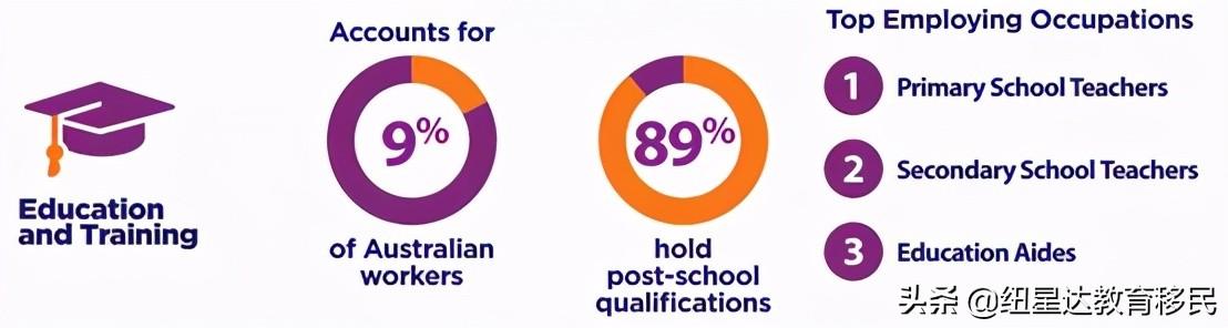 教育和培训是澳大利亚最大的就业领域之一,职业包括各个层次的教学职业学校,包括Lecturer和Tutor。其中89%的从业者拥有高等学历(包括Diploma)。此外,约 71%的劳动力是女性,是女性从业比例第二高澳大利亚领域。且兼职工作也相对常见,约占从业者的 40%。