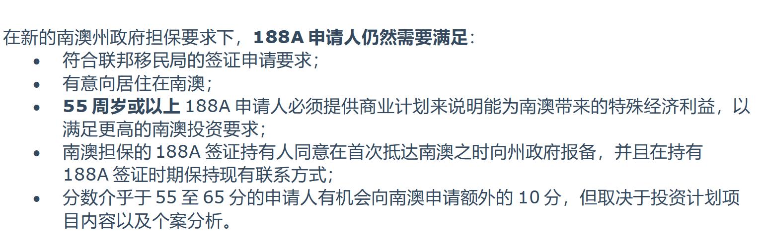 不过最夸张的还是新州政府上调的净资产要求与营业额要求,在大悉尼地区,申请人企业或个人净资产要求高达175万澳币,偏远地区为125万澳币;而企业营业额悉尼地区需要125万澳币(每财年),偏远地区需要75万澳币每财年。办理188A的最终目的一直都是为了转888拿绿卡,又是蹲移民监又要花这么多钱,这么多精力,条件还这么高,能满足这些条件的企业老板直接做132就可一步拿绿卡了,可比这要省事多。所以新州188A,针对的是条件非常特殊或有极特殊需求的投资者。