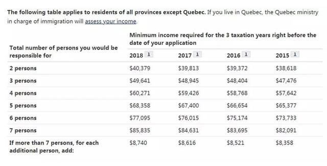 以魁省为例,过去3年的家庭总收入需要满足以下要求,表中的家庭人数包括:担保人、担保人配偶和未成年子女、被担保人、被担保人的配偶和未成年子女(即使不陪同来加拿大,也要算于其中)。