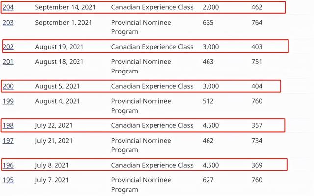 CEC是加拿大快速通道(Express Entry)类移民的一种,候选人大多从加拿大本国申请,且必须在加拿大有一年以上的全职工作经验。上图中红框部分是2021年7月以来的抽分结果,可以看出,相比8月19日的结果,本次的分数线几乎暴涨了60分,邀请人数也只有上次的三分之二,连7月底的一半都不到。