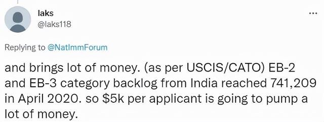 并带来很多钱。(根据 USCIS/CATO)来自印度的 EB-2 和 EB-3 类别申请在2020年4月时达到 741,209份。因此,每位申请人都交5000 美元的话将注入大量资金。
