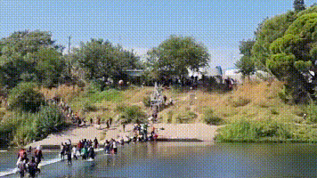 最近一周,该营地的难民人数骤涨,本周初仅有几百人,而周四则升至近万人。美国当地官员表示,预计未来几天还将有数千人穿越美墨边境河进入美国。视频显示,这条边境河仅有及膝深,肤色黝黑的难民扛着包裹、拖家带口蹚河上岸。