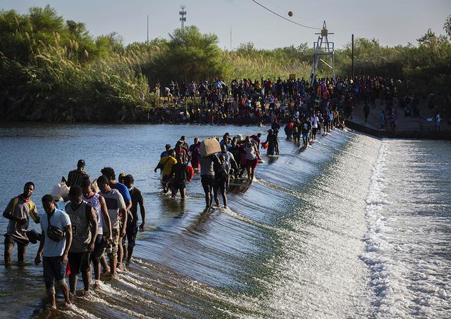 当地时间2021年9月17日,大批海地移民通过一座大坝从墨西哥进入美国。得州一名众议员18日前往该营地后表示,桥下的移民人数已接近1.5万人。