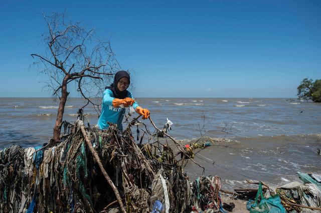 当地时间2021年9月19日,一名环保志愿者在印度尼西亚泗水海滩清理垃圾。世界清洁地球日活动于每年9月的第三个周末举行。