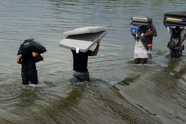当地时间2021年9月18日,美国德克萨斯州,海地移民头顶着家当从一座大坝进入美国。