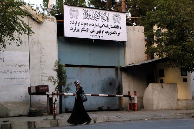 当地时间2021年9月18日,阿富汗喀布尔,前妇女事务部大楼门口,如今被“祷告指引与劝善惩恶的部门”取代。