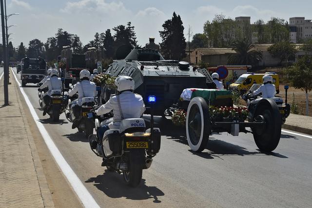当地时间2021年9月19日,在阿尔及利亚首都阿尔及尔,安全部队护送前总统布特弗利卡的灵柩前往公墓。据阿尔及利亚国家电视台17日晚报道,阿尔及利亚前总统布特弗利卡于当天晚上去世,享年84岁。
