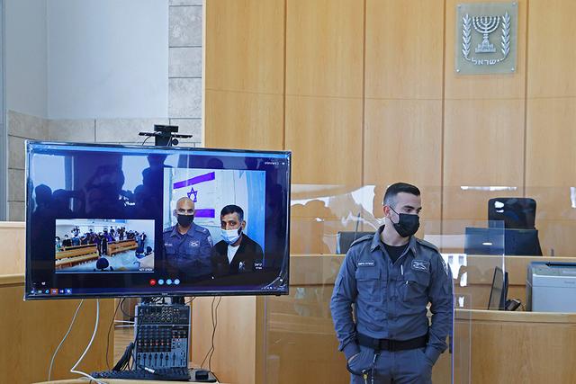 当地时间2021年9月19日,从以色列北部一所监狱逃走的巴勒斯坦囚犯穆罕默德·阿尔代(屏幕中,右一)被再次抓捕后在以北部城市拿撒勒通过视频连线出席庭审。