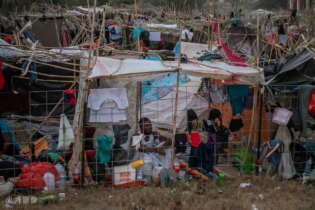 当地时间2021年9月21日,美国得克萨斯州德尔里奥市,非法移民涉水穿过美国与墨西哥边界河流进入美国,“驻扎”在一座跨国大桥下,并搭起临时营地。