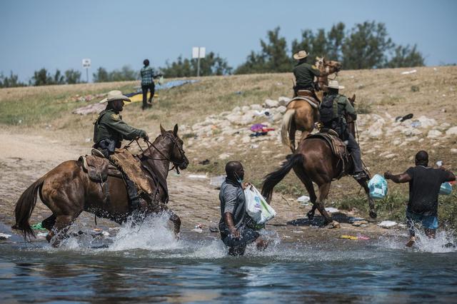 当地时间2021年9月19日,美国得克萨斯州边境城市德尔里奥,里奥格兰德河边,美国海关和边境保护局骑警试图控制非法移民,因为他们试图从阿库纳城穿越格兰德河进入得克萨斯。