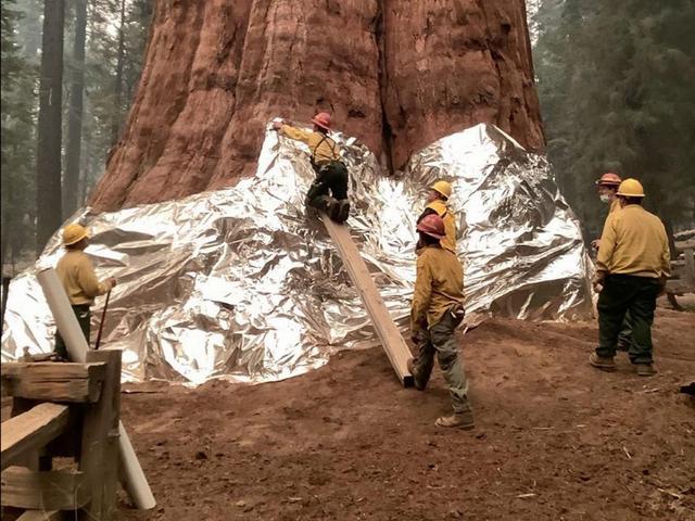 当地时间2021年9月17日,美国加利福尼亚州一片古老的巨型红杉林遭山火威胁,对“特大号”红杉,消防人员用铝制防火材料包裹树干,防止起火。
