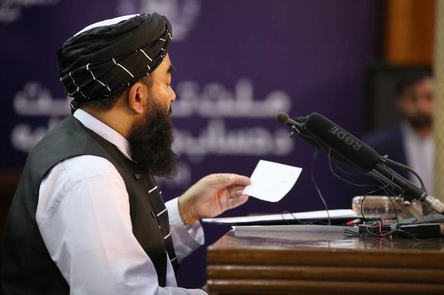 当地时间2021年9月21日,阿富汗喀布尔,阿富汗塔利班发言人穆贾希德在喀布尔信息中心(GMIC)召开新闻发布会。
