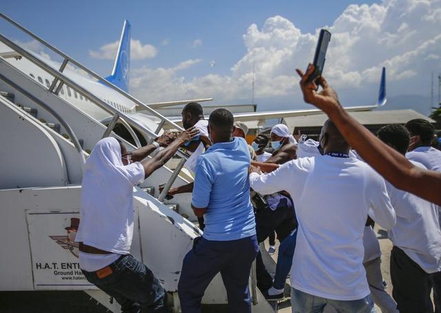 当地时间2021年9月21日,海地太子港,非法移民试图冲回飞机。被美国遣返的非法海地移民搭乘飞机回国,抵达机场。