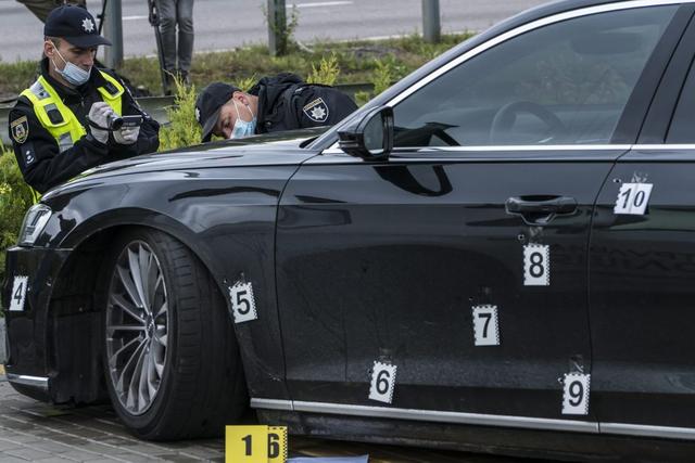 当地时间2021年9月22日,乌克兰基辅,警方正在检查子弹击中的汽车。