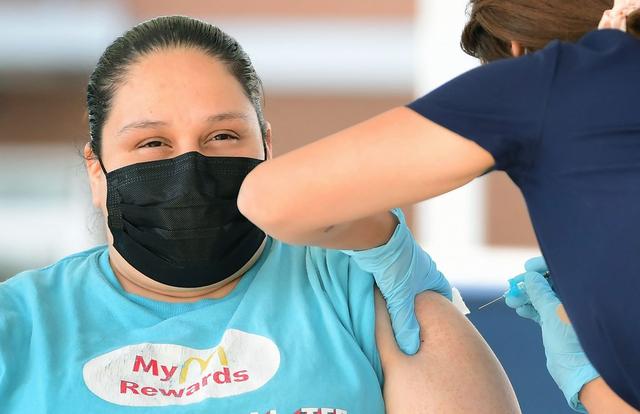 当地时间2021年9月21日,美国加州洛杉矶,民众在加州公共卫生部的移动诊所接种新冠疫苗。