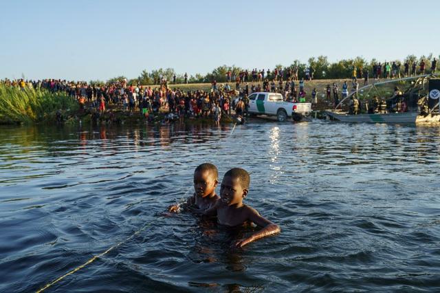 当地时间2021年9月20日,墨西哥科阿韦拉州阿库尼亚城,两个海地男孩试图穿过美墨边境的里奥格兰德河进入美国得克萨斯州。