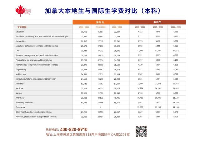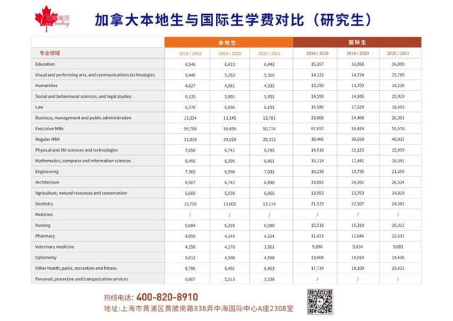 我们来看一个表格,从2018年至2021年,加拿大国际生和加拿大本地生的本科专业及研究生专业的平均学费对比图: