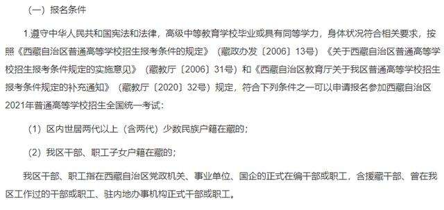 根据西藏教育考试院公布的2021年普通高等学校招生规定显示,援藏干部、曾在西藏工作过的干部子女户籍在藏的,符合高考报名条件。