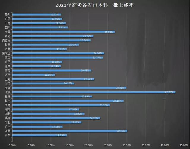 从整体数据来看,2021年高考各省市本科一批/特殊控制线上线率均超过10%,其中上线率最高的为北京市,2021年高考报名人数5.17万,上线总人数22100,上线率42.75%,上线率最低的为河南省,本科一批上线率11.18%;
