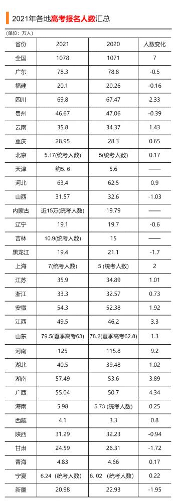 2021年我国高考报名人数达1078万,比去年增加7万,再创历史新高。全国高考报名人数在2007年首次突破千万之后,连续三年保持在千万以上,直到2010年开始下降,并连续9年保持平稳,平均在940万人左右。2019年高考报名人数再次突破千万,今年更是创下新高。