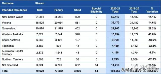 报告比较直观的体现了最受澳洲移民欢迎的目的地,前3名的分别是新州(NSW)50,417个、维州(VIC) 39,170个、昆州(QLD) 22,903个。其后的依次是:西澳(WA) 15,994个、南澳(SA) 9,769个、塔州(TAS)4,169个、堪培拉(ACT)4,168个、北领地(NT)2,243个、未指明11,219个。