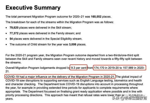 众所周知,20-21财年澳洲移民总配额计划为160,000人,而实际发放人数为160,052 人。其中,技术移民 79,620 个,家庭移民77,372 个,特殊资格 54 个,Child stream 3,006 个。报告还显示,在申请递交人数方面,对比19-20财年的174,170人,今年下降了9.3%,只有157,989人。导致移民数量下降最直观也是最主要的原因即是COVID-19(新冠肺炎疫情)的影响。