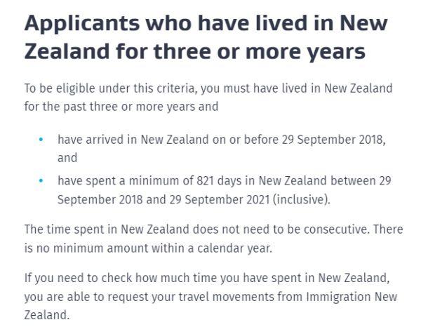 1)申请人需要在2018年9月29日前入境新西兰, 且2018年9月29 - 2021年9月29日之间在新西兰住够了821天, 不要求连续居住, 没有3年内每年多少天的限制, 居住期无签证类别限制,也就是你这821天中,即使是读书也行。