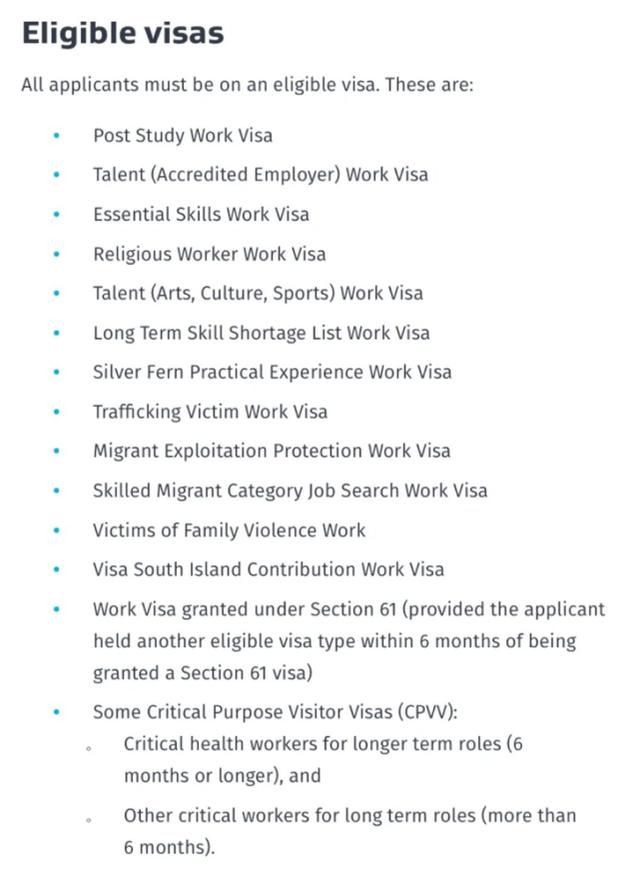 基础条件:申请人必须在2021年9月21日当天在新西兰,且持有或已递交有效工作签证,具体包含的工签类别见下图(学签,旅游签,打工度假签等临时签证不包括)
