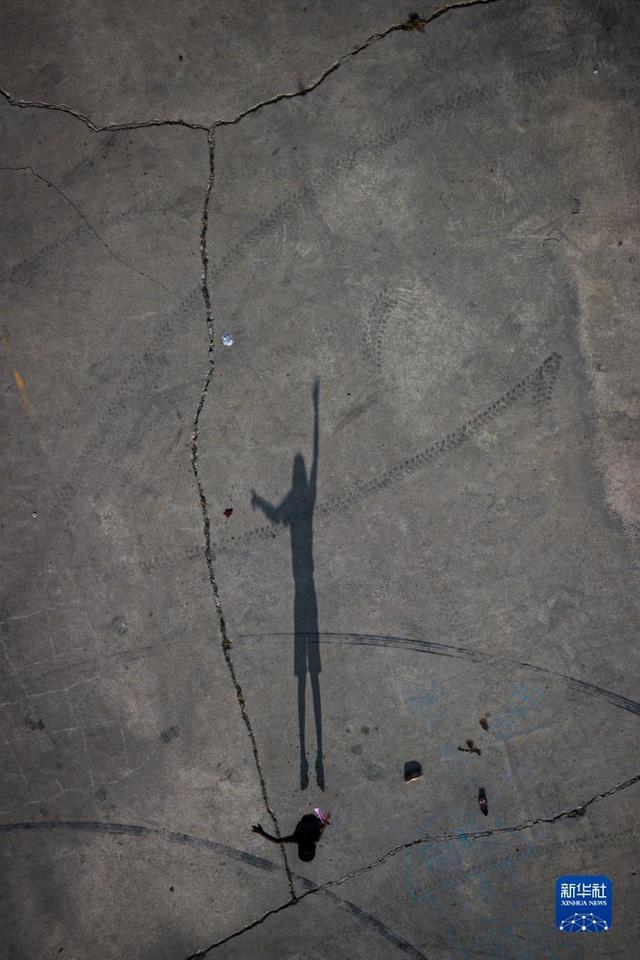 9月29日,一名移民儿童在墨西哥阿库尼亚城的一处收容所内玩耍(无人机拍摄)。