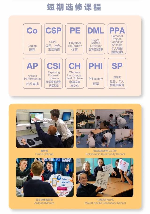 在爱尔兰,孩子初中开始就会有短期选修课程,这些课程均为爱尔兰国家课程和评估委员会(NCCA)根据社会的发展需要来指定的,并且会依据时代的进步,不断的调整,旨在让孩子能在与世界接轨,走在社会的前沿。