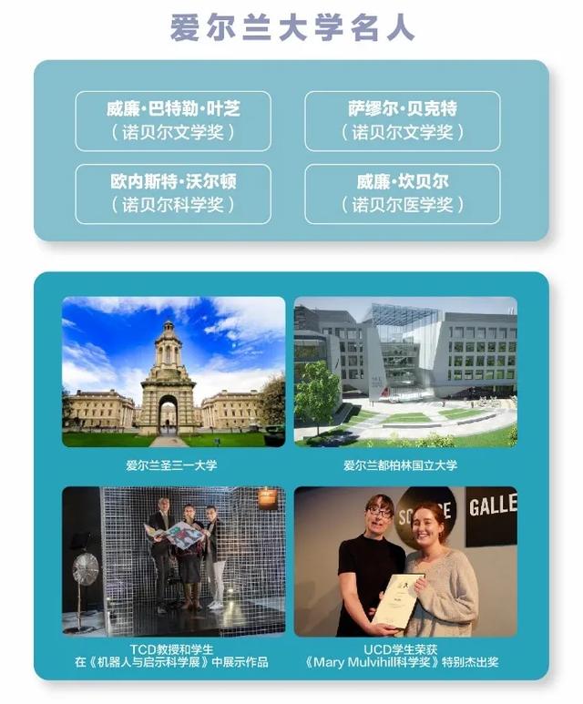 爱尔兰高校历史悠久,培育出多位诺贝尔奖得主,为世界输送了非常多的人才。例如爱尔兰圣三一大学,它与牛津大学、剑桥大学并成为“欧洲三剑客”。