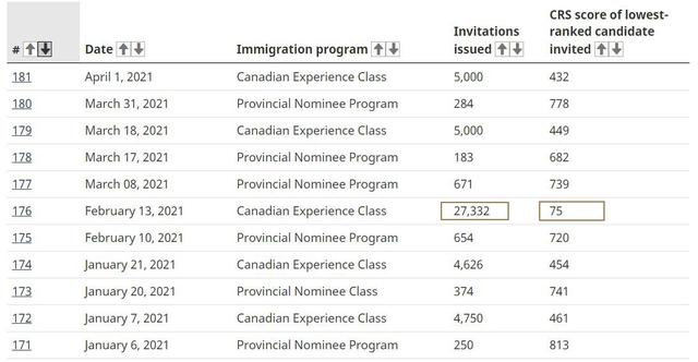 移民局在2月13日从联邦EE系统中的经验类邀请申请人,只要申请人在CRS打分系统中满足75分(史上最低分)。