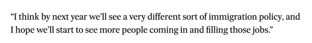 “我认为到明年我们会看到一种非常不同的移民政策,我们会有更多的技术人员进来填补目前空缺的工作岗位。”